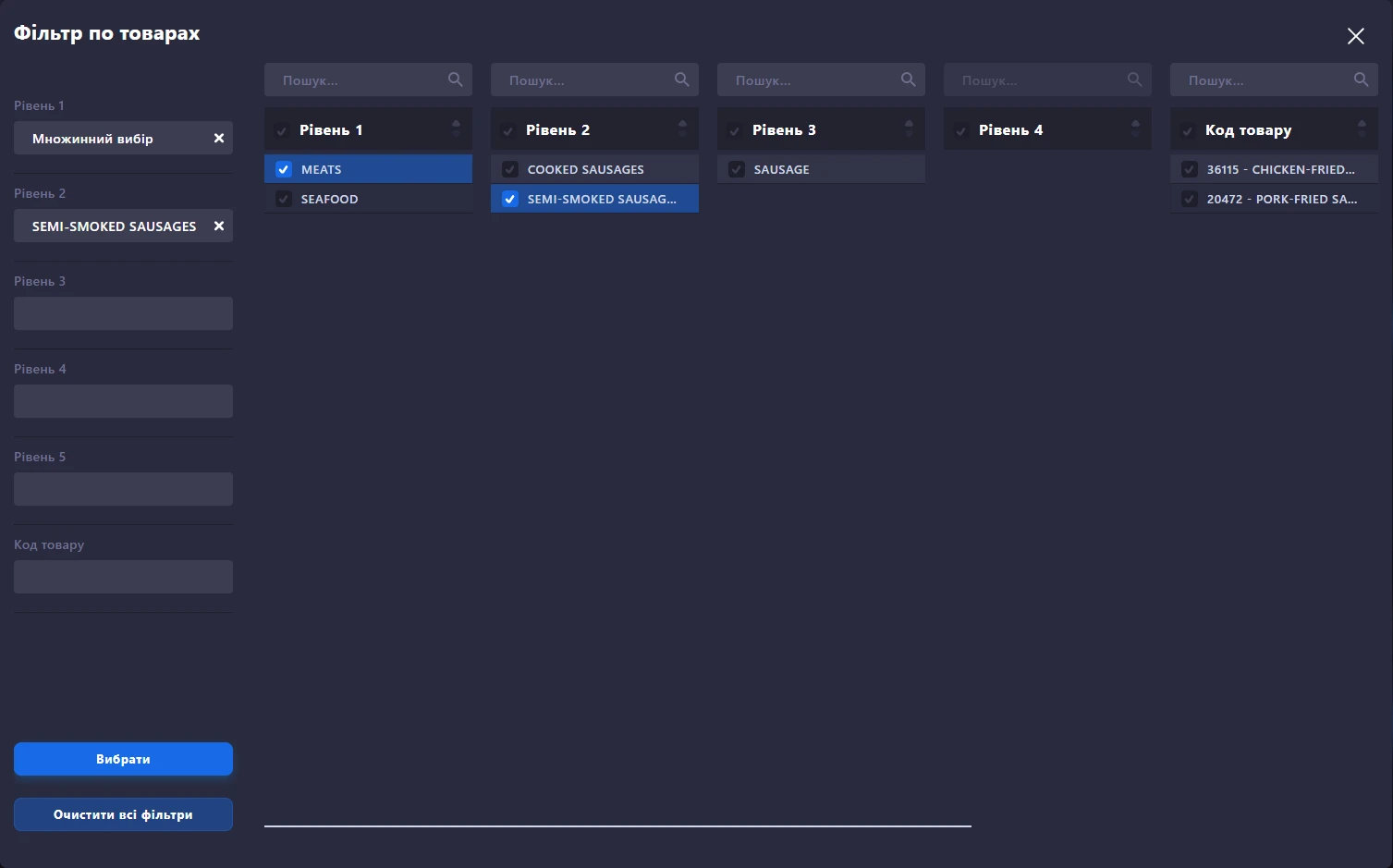 У відповідності до рівнів продуктової ієрархії та рівнів фільтрації по магазинах система передбачає застосування у блоці моделювання фільтрів для інформації, що відображається на ньому.