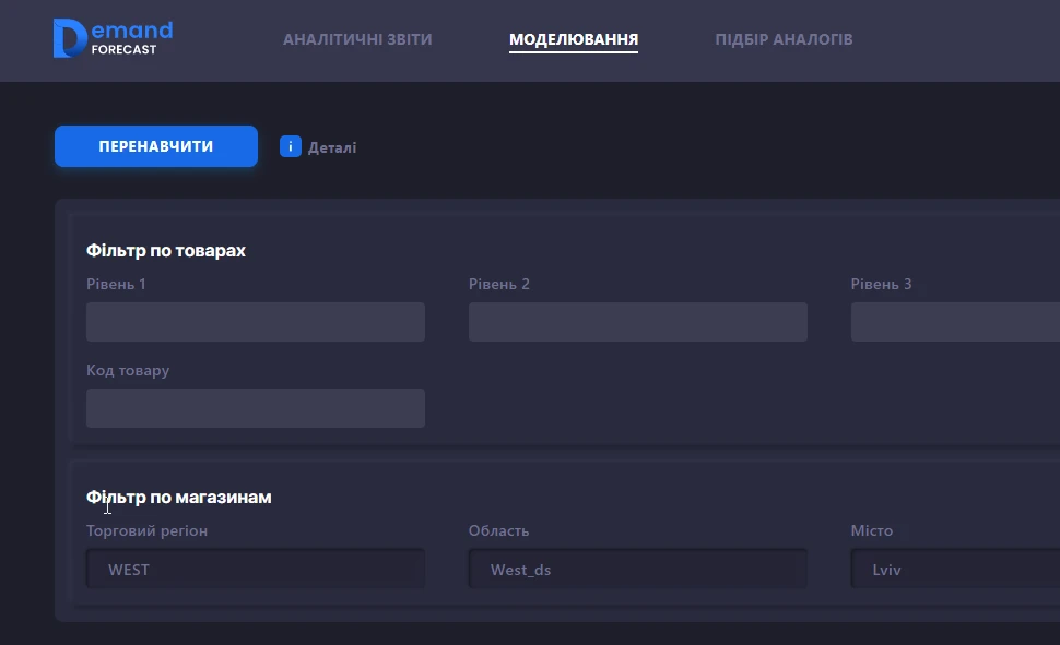 В інтерфейсі системи прогнозування попиту користувачам з відповідними правами доступу дозволено запускати процес навчання моделі.