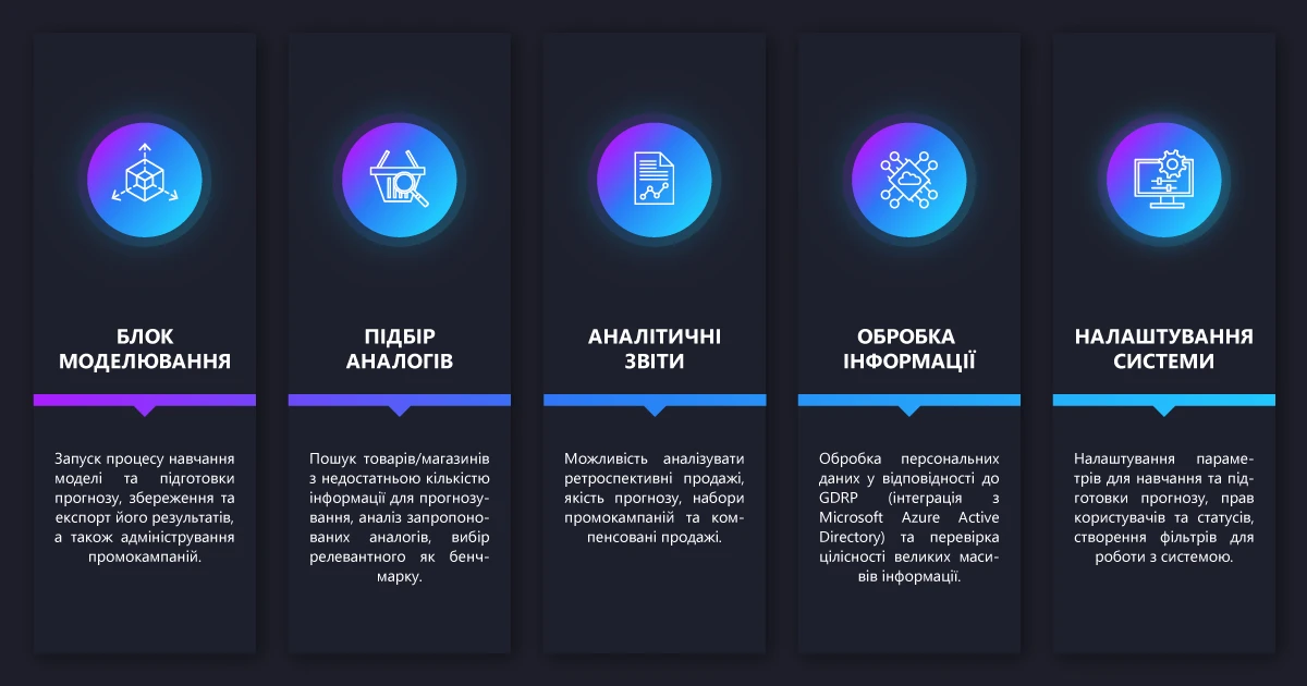 Роботу системи SMART Demand Forecast забезпечують 5 блоків: моделювання, підбір аналогів, аналітичні звіти, обробка персональної інформації та налаштування системи.